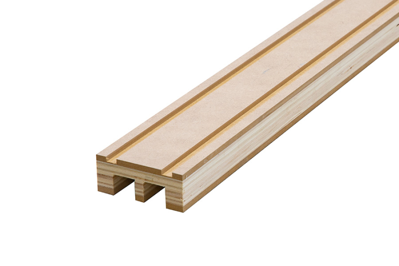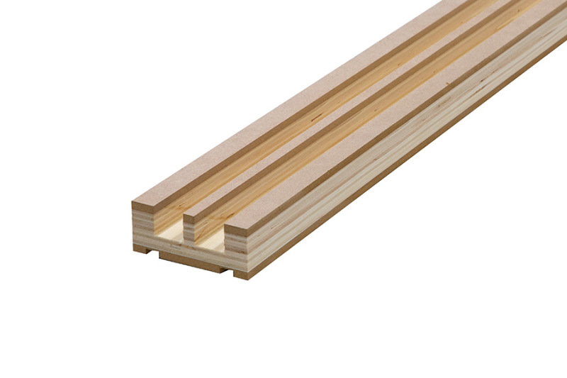 LVLの表裏面にMDFを貼り合わせた材であり、LVLの強度とMDFの表面性を兼ね備えた加工材。